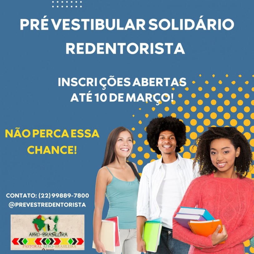 A pastoral Afro-Brasileira do Santuário Nossa Senhora do Perpétuo Socorro de Campos dos Goytacazes está com inscrições abertas para o curso de pré-vestibular solidário, que terá duração de oito meses. O início das aulas está marcado para o dia 26 de março, com término em 12 de novembro. O curso é totalmente gratuito.