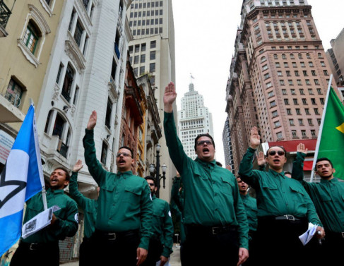 Anauê atual: Membros do movimento neointegralista se reúnem no Vale do Anhangabaú, em São Paulo, em 2019.