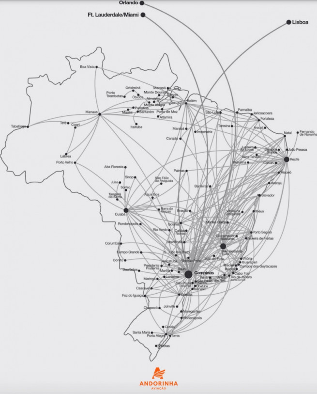 No amplo e ambicioso mapa divulgado pela empresa (confira abaixo), das muitas rotas alvo a serem cobertas, pode-se notar Campos presente nele, com ligações ao Rio e Belo Horizonte. Em estratégia similar à Azul, a Andorinha prevê hub principal em Campinas e hubs secundários, como BH, Recife e Cuiabá.