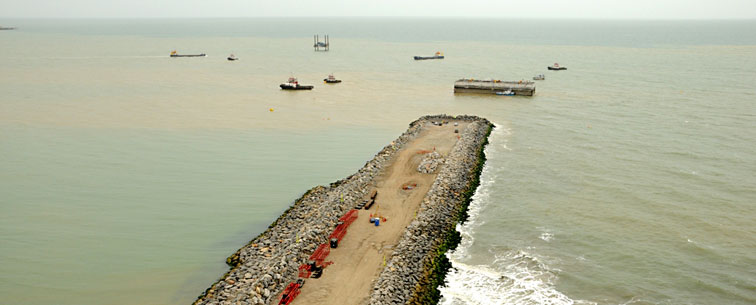 O quebra-mar será composto pelos 42 blocos de concreto e por pedras e terá 1.466 metros de comprimento no sentido norte e 2.363 metros no sentido sul, permitindo a entrada e saída de navios do canal.