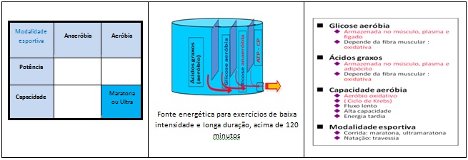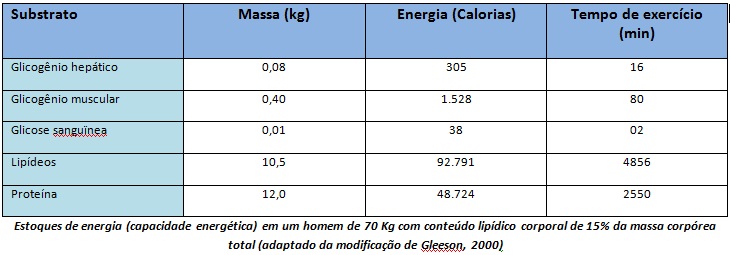 Desta forma, sabemos que dois tipos de substrato energéticos são mais importantes, a glicose que contém na sacarose (açúcar) e nos alimentos ricos em amido (arroz, batatas, massas, pães, mandioca, etc.) e os ácidos graxos (proveniente dos triglicérides das células de gordura -adipócitos – e óleos vegetais). A questão reside no fato de que a energia estocada no nosso corpo na forma de glicose, não daria para um dia de vida; contudo a energia na forma de ácidos graxos ou triglicérides daria para mais de 30 dias de vida, como temos na tabela a seguir: