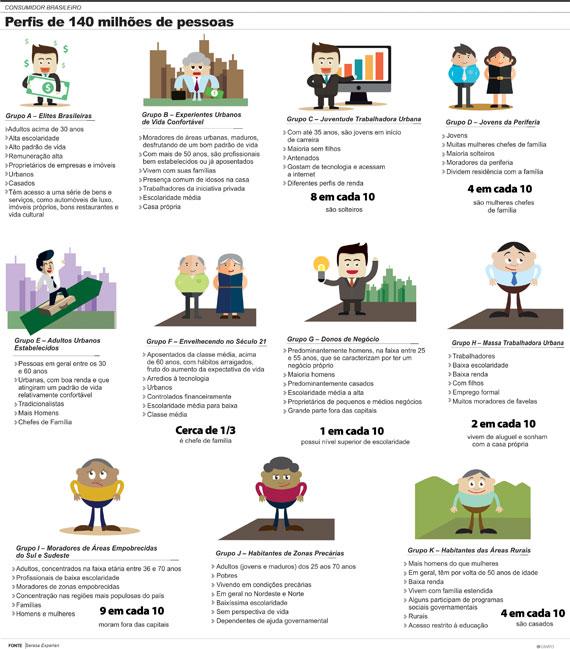 A Serasa Experian revelou o perfil de consumo da população brasileira acima de 18 anos. O levantamento é um retrato acurado dos perfis que compõe a população do país. A divisão básica por renda, entre classes A a E, pode já não representar devidamente o perfil múltiplo e dinâmico da população brasileira.