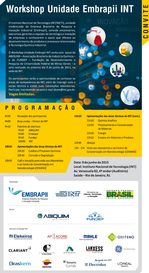 Unidade credenciada da Empresa Brasileira de Pesquisa e Inovação Industrial (Embrapii), o Instituto Nacional de Tecnologia (INT/MCTI) realizará no dia 9 de junho, em sua sede, no Rio de Janeiro, um workshop destinado a mostrar às empresas as possibilidades de suporte tecnológico que oferece ao desenvolvimento de produtos e processos relacionados a tecnologia química industrial. As inscrições, gratuitas, são destinadas a empresários, executivos gerentes e equipes de tecnologia e inovação, estando limitadas à lotação do auditório do INT, com cem lugares.