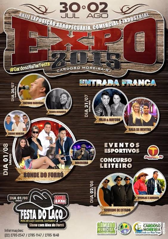 A Prefeitura divulgou oficialmente as atrações de mais uma Exposição Agropecuária, Comercial e Industrial de Cardoso Moreira. Do dia 30 de Julho ao dia o2 de agosto próximo. Os cardosenses e visitantes vão ter forró, pagode, axé e rock-roll. Além da alegria do reencontro de parentes e amigos, verdadeiro e principal motivo. A festa este ano será um pouco diferente das anteriores em relações ao custo de shows de maior renome nacional, economizando para manter a tradição da comemoração da Emancipação tão sonhada. A vizinha Italva deixou de fazer alegando razões de crise e foi um desastre, frustrando a maioria da população.