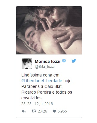 A noite dessa terça-feira foi de Ricardo Pereira e Caio Blat. Na pele do coronel Tolentino e do advogado André, respectivamente, os dois protagonizaram em “Liberdade, Liberdade” a primeira cena de sexo gay numa novela brasileira. O resultado? Milhões de elogios que fizeram a trama das 23h da TV Globo virar o assunto mais comentado mundialmente no Twitter.