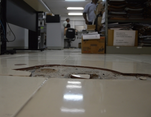 Segundo a equipe que integra o novo governo em Campos, tetos com infiltração, vazamento em grande parte dos aparelhos de ar-condicionado próximos a fiação de computadores, pisos quebrados, falta de organização nos estoques e materiais sucateados são alguns dos problemas estruturais encontrados no Centro Administrativo José Alves de Azevedo.