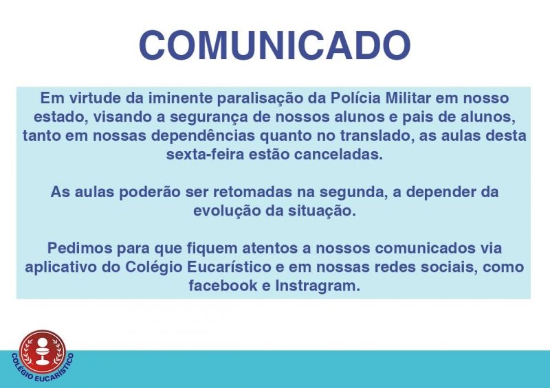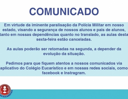 Desde o início da semana, a possibilidade de paralisação da Polícia Militar do Estado do Rio de Janeiro a partir desta sexta (10) assusta a população. Nesta véspera de possível início de paralisação, o Colégio Eucarístico decidiu por cancelar as aulas que estavam programadas para amanhã. Também não haverá atendimento administrativo na unidade. Após o anúncio, o Centro Educacional Nossa Senhora Auxiliadora, Colégio Batista, Colégio Prouni, João XXXIII e o Alpha Colégio e Pré-Vestibular também confirmaram a suspensão das atividades. Já o Instituto Federal Fluminense - campus Centro e Guarus - decidiu por manter o cronograma de aulas. A Secretaria de Estado de Educação (Seeduc) informou que manterá o funcionamento das escolas públicas estaduais em Campos dos Goytacazes.