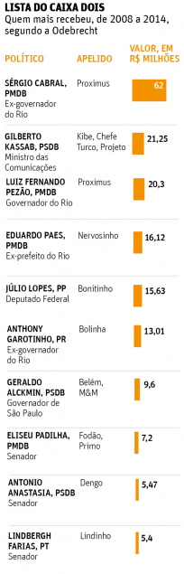 O ex-governador Sérgio Cabral (PMDB) lidera com folga o ranking dos que mais receberam caixa 2 da Odebrecht entre os anos de 2008 e 2012, segundo o documento: foram R$ 62 milhões. O ex-ministro das Comunicações Gilberto Kassab (PSD) é o segundo, com R$ 21,2 milhões. Depois, mais cinco nomes do Rio, em ordem: o governador Luiz Fernando Pezão (PMDB), com R$ 20,3 milhões; o ex-prefeito do Rio Eduardo Paes (PMDB), com R$ 16,1 milhões; o deputado federal Júlio Lopes (PP), com R$ 15,6 milhões e Garotinho, com R$ 13 milhões.