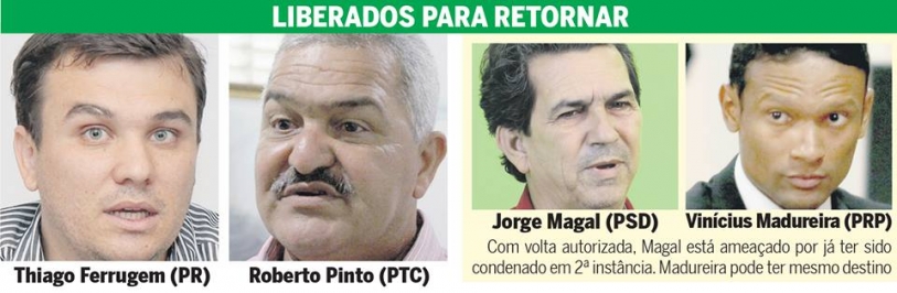 Foi na extensão da decisão do TSE que a 100ª ZE liberou na última quarta-feira os retornos de Ferrugem, Roberto Pinto, Madureira e Magal. Até que a 76ª ZE de Campos, o TRE e o TSE esclareçam a situação dos outros seis, o presidente Marcão disse que Thiago Virgílio, Linda Mara, Kellinho, Jorge Rangel, Ozéias e Miguelito terão que aguardar. Até lá, em seus lugares permanecem vereadores Neném (PTB), Álvaro Oliveira (SD), Joilza Rangel (PSD), Cabo Alonsimar (PTC), Carlinhos Canaã (PTC), e Geraldinho Santa Cruz (PSDB).