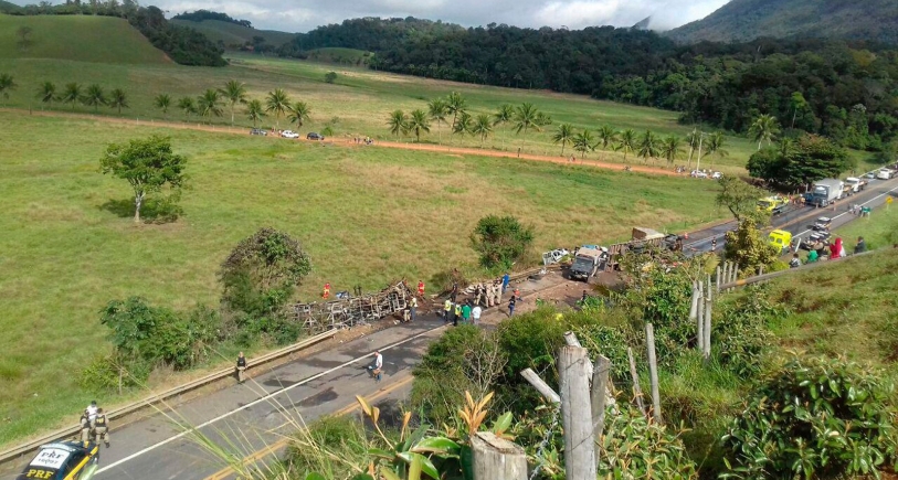 Pelo menos 22 pessoas morreram e outras 21 ficaram feridas em um grave acidente na manhã desta quinta-feira, no quilômetro 343 da BR 101, em Guarapari, no Espírito Santo. O acidente, ocorrido por volta das 6h10, envolveu um caminhão carregado de granito, um ônibus da Viação Águia Branca, que fazia a linha São Paulo-Vitória, e duas ambulâncias. Com o impacto da colisão, o ônibus capotou à margem da pista e incendiou. Várias vítimas morreram carbonizadas. Segundo funcionário do guichê da Águia Branca, o coletivo não fez parada na rodoviária Shopping Estrada, em Campos, para embarque de passageiros. Os dois sentidos da BR 101 ficaram interditados, causando um congestionamento de mais de cinco quilômetros. A Polícia Rodoviária Federal (PRF) orientou que os motoristas utilizassem rotas alternativas.