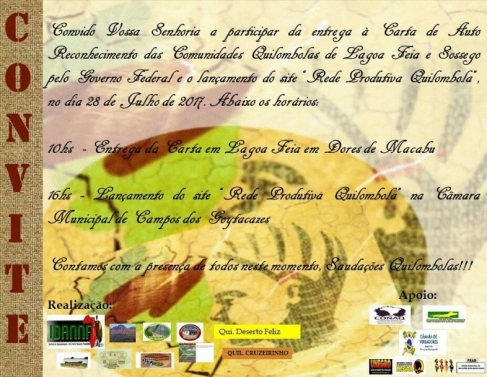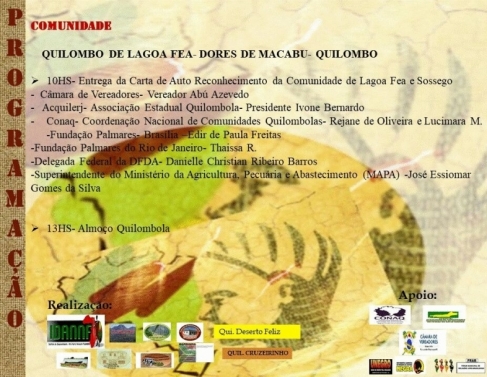 Após mais de 10 anos de expectativa, finalmente as comunidades de Lagoa Feia e Sossego serão reconhecidas como Comunidades Quilombolas. A certificação é através de uma carta dada pelo Governo Federal. O evento de legitimação acontece na próxima sexta-feira (28), às 10h, quando vai ser entregue a carta de autoreconhecimento das comunidades quilombolas.