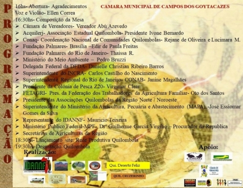 Na oportunidade também vai ser lançado, na parte da tarde, na Câmara Municipal de Campos, o site da Rede Produtiva Quilombola. O evento conta com o apoio do vereador Abu, que justifica a importância da iniciativa lembrando que Campos é a cidade com maior numero de comunidades quilombolas do Rio de Janeiro. Sete reconhecidas e dez em pesquisa.