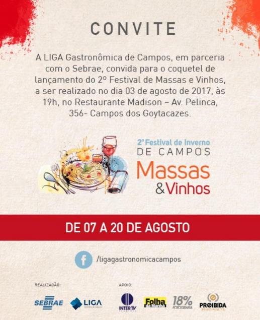 Acontece nesta quinta-feira (3), às 19h, no restaurante Madson, localizado na avenida Pelinca, o lançamento do 2º Festival de Inverno Massas e Vinhos de Campos. O evento, que tem apoio da Folha da Manhã, é organizado pela LIGA Gastronômica do município, em parceria com o Sebrae. O festival terá início no dia 7 de agosto, com término no dia 20 do mesmo mês.