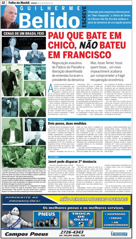 Por outro lado, não se pode desconsiderar que no Brasil o fato do dia, do momento, se coloca acima da lei e da justiça. Afinal se Dilma Rousseff foi afastada pelos crimes a ela imputados, o que dizer de Temer, na escabrosa denúncia de corrupção passiva, praticada em ambiente de porões?