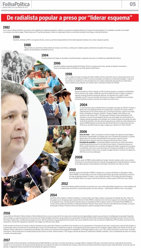 Ex-prefeito, ex-governador, ex-secretário de Estado, ex-deputado federal e ex-secretário do Governo Rosinha, Anthony Garotinho foi preso pela Polícia Federal, na manhã dessa quarta-feira (13), no Rio, enquanto apresentava seu programa na Rádio Tupi. Condenado a nove anos e 11 meses de prisão no caso Chequinho por corrupção eleitoral, repetida 17.515 vezes, associação criminosa, supressão de documento e coação no curso do processo, Garotinho foi transferido para Campos, onde colocou tornozeleira eletrônica e cumprirá prisão domiciliar na casa da Lapa. As medidas restritivas deverão ser mantidas até o julgamento pelo Tribunal Regional Eleitoral (TRE). Se confirmado o entendimento do juízo local, Garotinho deverá cumprir a pena em regime fechado. Segundo sentença do juiz Ralph Manhães, da 100ª Zona Eleitoral, enquanto exercia o último cargo público, Garotinho utilizou o programa social Cheque Cidadão para compra de votos, gerando prejuízo aos cofres públicos de R$ 11 milhões. Na decisão, o juiz fala, também, que ele praticou uma série de atos para impedir o avanço da Ação Penal e que o “grupo criminoso comandado pelo réu” coagiu e intimidou testemunhas, inclusive com emprego de arma de fogo. A defesa do condenado repudiou a prisão e já ingressou com Habeas corpus (HC) junto ao TRE. A ex-prefeita Rosinha acompanhou o marido e se mostrou indignada com a condenação, creditando à perseguição política.