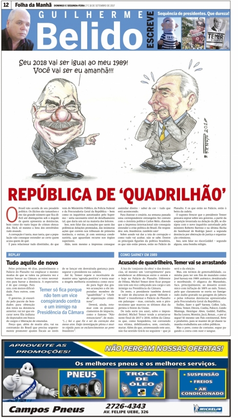 Mas, em termos de governabilidade, caminha para ter um fim de mandato como José Sarney em 1989: anêmico, desidratado e moribundo. O oligarca do Maranhão, face, principalmente, ao desastre econômico com inflação de 100% ao mês. Temer, pelo que claramente se ouviu no famigerado áudio gravado na garagem do Jaburu e pelas robustas denúncias apresentadas pela Procuradoria Geral da República.