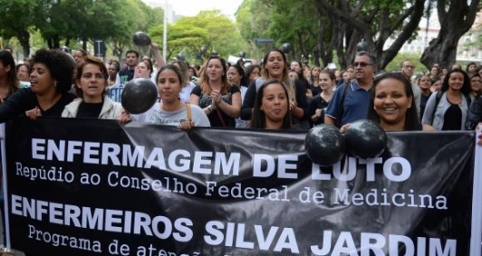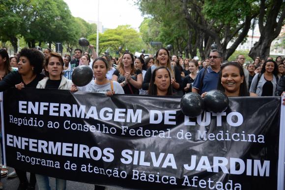 Centenas de enfermeiros realizaram nesta segunda-feira (16) um protesto no Rio de Janeiro contra decisão da Justiça Federal que os proíbe de requisitar exames na atenção básica. Com o apoio de usuários do Sistema Único de Saúde (SUS), de profissionais de outras áreas, de estudantes e de professores, eles se mobilizaram vestindo roupas pretas em frente à sede do Conselho Regional de Medicina do Rio de Janeiro (Cremerj).