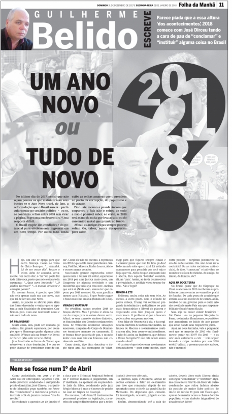 Suscitando grande expectativa sobre quem mais o Gilmar irá soltar, esperamos em 2018 por uma Justiça mais coesa, um Congresso de alguma seriedade e um ministério que não seja essa mer.. meleca que está aí. (Neste caso, vamos ter que esperar por 2019 mesmo). Ah, uma gasolina menos cara (Hahaha). E que Pezão pague o funcionalismo em dia (Hahaha de novo).