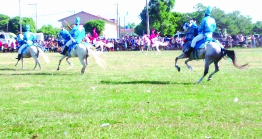 A Cavalhada é uma dramatização da batalha e referência à reconquista de território na península Ibérica pelos cristãos, vestidos de azul, após 800 anos de dominação moura, representados pelas vestes vermelhas. A tradição chegou ao Brasil com os colonizadores portugueses.