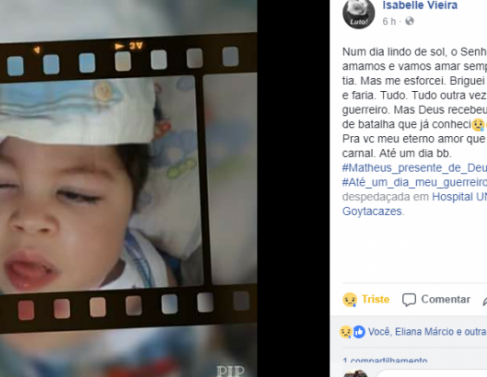 A tia de Matheus, Isabelle Vieira, usou as redes sociais para falar sobre o falecimento do pequeno. “Num dia lindo de sol, o Senhor te chamou bebê. Te amamos e vamos amar sempre. Nunca fui a melhor tia. Mas me esforcei. Briguei por você como seus pais e faria tudo, tudo outra vez. Perdemos nosso guerreiro. Mas Deus recebeu de volta o maior anjo de batalha que já conheci. Pra você meu eterno amor que romper a matéria carnal. Até um dia bebê”, destacou, mostrando ainda gratidão em outra postagem. “Quero agradecer a todos que estiveram nos apoiando nesse momento de imensa dor. Aos que não puderam estar presentes, sabemos que foi tudo muito rápido. Mas foi melhor assim. Às vezes é difícil entender os planos de Deus e seus propósitos. Mas creio que a vontade Dele será sempre: boa, perfeita e agradável aos seus filhos. Lutamos por Matheus e continuaremos a lutar pelos anjos esquecidos pelo poder público. Deixo aqui minha eterna gratidão ao nosso menino de ouro. Que nos ensinou a solidariedade, o amor ágape. Nos ensinou que família rompe os laços de sangue. Que pra ter alguém especial, é preciso ser especial”, finalizou.