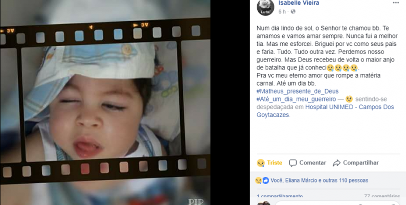 A informação da morte de Matheus foi divulgada pelo blog Na Curva do Rio, da jornalista Suzy Monteiro. O sepultamento da criança aconteceu, segundo funcionários do Campo da Paz, às 17h de ontem. “Aos dois anos e sete meses, o bebê Matheus não resistiu em mais uma internação e veio a falecer. Embora não conheça a família pessoalmente, a luta deles sempre me emocionou muito pela garra, determinação e amor pelo pequeno anjo. E por todas as vezes que eles tiveram que gritar ao mundo para conseguir algo para o bebê, algumas, ecoadas no blog”, lamentou Suzy.
