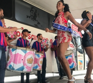 Na frente do ônibus os olhares foram voltados para a atração carnavalesca que, como previsto, atraiu muitos interessados na doação. O presidente da escola, Marcelo Velasco, contou da satisfação que é participar do projeto. “Essa parceria com o Hemocentro é muito importante para atrair a população e nós ficamos muito felizes em poder ajudar”, disse Marcelo. A rainha de bateria, Kellen Gaia, completou: “A doação de sangue é uma forma de salvar vidas e por isso é tão satisfatório poder contribuir trazendo a nossa alegria”.