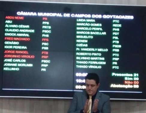 Mesmo desfalcada de um de seus líderes, o vereador Fred Machado (PPS), que passou mal e não pôde estar presente na sessão extraordinária da Câmara Municipal entre o final da manhã e a tarde desta sexta-feira (9), a base governista aprovou o projeto enviado com urgência pelo prefeito Rafael Diniz (PPS) à Casa, reduzindo em 35% o valor cobrado para parte do comércio e da indústria na contribuição de iluminação pública, após a constatação de um erro técnico na matéria anterior. Dos 21 vereadores presentes, 14 foram favoráveis ao projeto, com exceção dos sete que fazem parte da oposição.