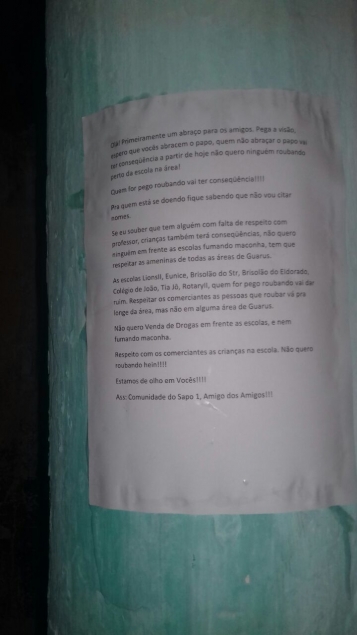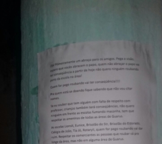 A Prefeitura de Campos suspendeu as aulas, nesta quarta-feira (21), em todas as escolas municipais instaladas nos bairros Codin e Parque Eldorado, em Guarus. A secretaria municipal de Educação, Cultura e Esporte (Smece) informou que medidas estão sendo adotadas para preservar a integridade física dos alunos e funcionários. Por meio das redes sociais, moradores da área mais afetada pela violência em Campos compartilharam um recado colado por uma facção criminosa em postes da área de Guarus. O aviso teria sido divulgado pelos Amigos dos Amigos (ADA) e direcionado à pessoa que roubar em torno das escolas, desrespeitar professores, comerciantes, vender drogas ou fumar maconha em frente às unidades. Segundo a mensagem, todos serão punidos, incluindo crianças.