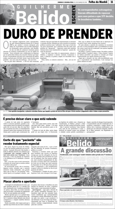 Não agora, depois da sessão de 5ª-feira, 22, mas em matéria publicada em 04 de fevereiro, ‘A grande discussão’ (fac-símile), a Folha da Manhã advertiu em sub-título que ‘Condenado, Lula ‘consegue’ reabrir debate sobre prisão em 2ª instância’. Como ilustração, a foto da fachada do Supremo e da militância do PT dividindo o mesmo espaço.