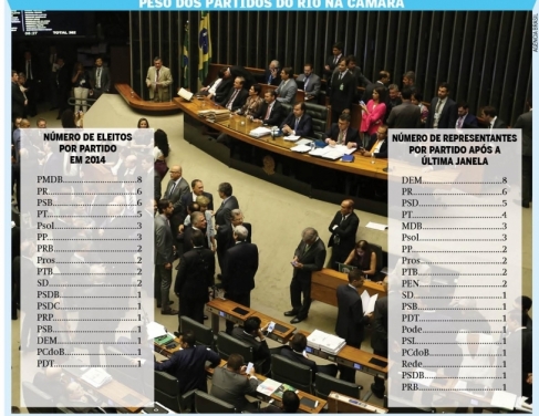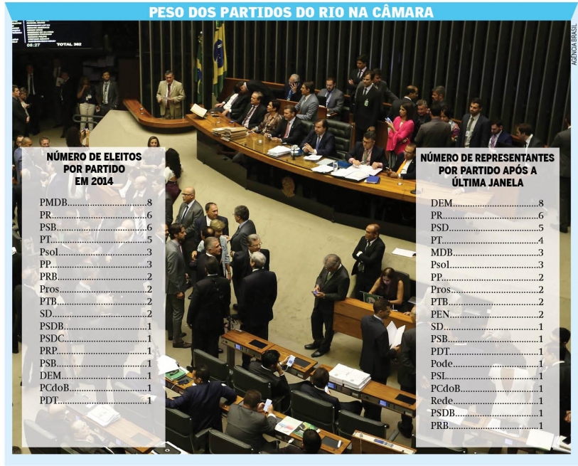 Balanço nacional — Mesmo em um dos seus piores momentos históricos, com o ex-presidente Luiz Inácio Lula da Silva, o PT voltou a ter a maior bancada na Câmara dos Deputados: são 60 parlamentares, segunda dados disponibilizados pela assessoria da Câmara. O MDB do presidente Michel Temer tem 51 — mesmo número de deputados do PP. Vale destacar que o MDB e o PP são partidos que também estão no centro das investigações da Lava Jato. O PSDB caiu para 47 deputados, enquanto o DEM saltou de 21 eleitos em 2014 para 44 após o encerramento da última janela. A chegada de Bolsonaro ao PSL pode não ter tido resultado na bancada fluminense, mas no balanço geral ajudou o partido a subir de um eleito no último pleito para oito representantes atualmente.