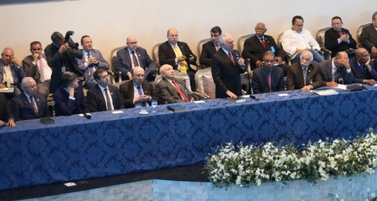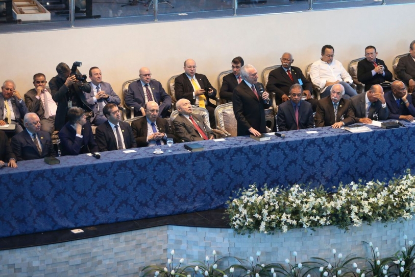 O presidente estava acompanhado do pré-candidato do MDB, Henrique Meirelles, e disse que mantinha em sua mesa, na Presidência da República, dois livros: a Constituição Federal e a Bíblia.