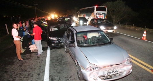 Um engavetamento envolvendo oito carros de passeio deixou cinco pessoas feridas, por volta de 19h desta sexta-feira, no Km 70 da BR 101, Rio – Campos. Segundo a Autopista Fluminense, o motivo do acidente seria o fluxo intenso de veículos na via. Foi registrado um quilômetro de congestionamento nos dois sentidos da rodovia logo após a colisão.