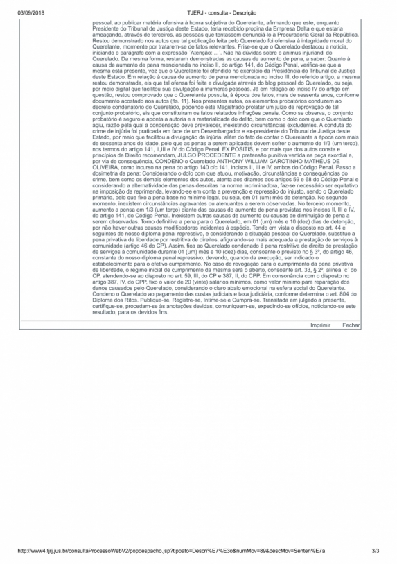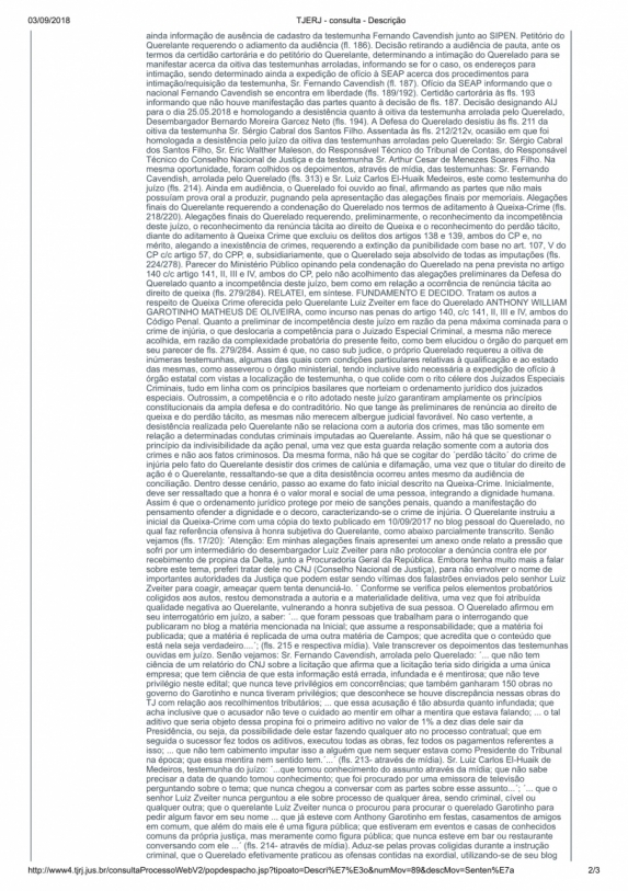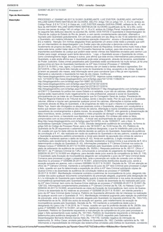 O ex-governador Anthony Garotinho (PRP) foi condenado a 1 mês e 10 dias de detenção por injúria ao desembargador Luiz Zveiter. Em 2016, durante a operação Chequinho - que o levou à prisão por duas vezes - Garotinho creditou a situação à perseguição política e jurídica, em parte por denúncias que fez contra o desembargador.