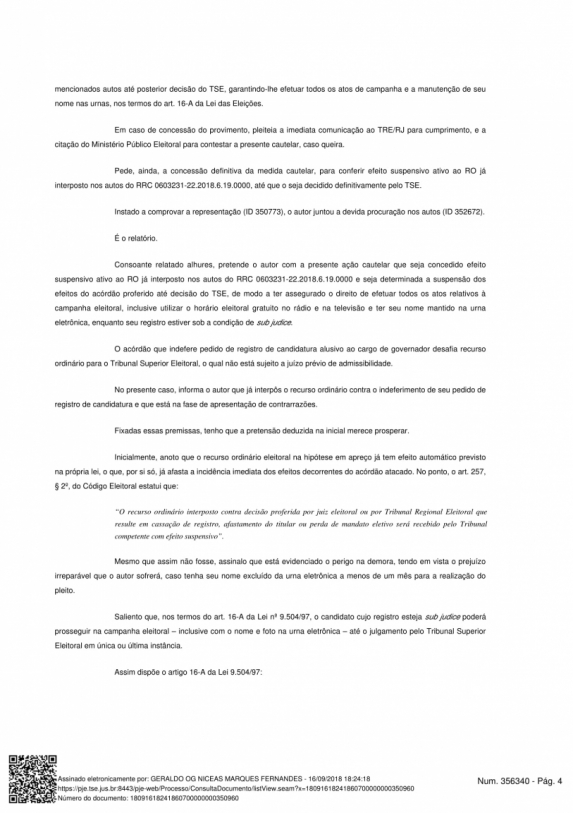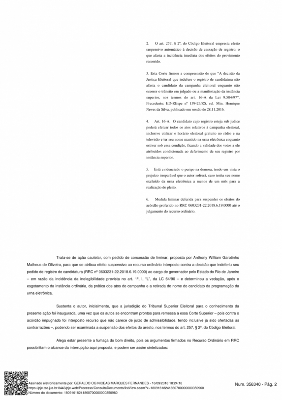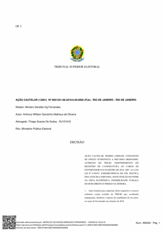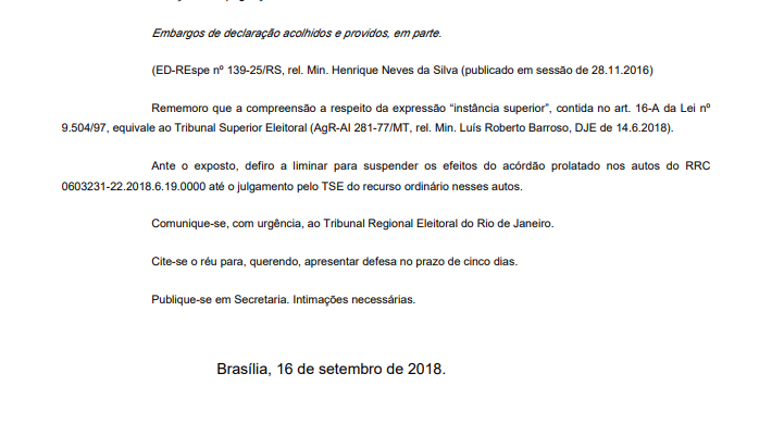 Og Fernandes garantiu, na decisão, que Garotinho possa cumprir todos os atos de campanha, inclusive participar do programa eleitoral gratuito. A medida vale até o julgamento do TSE.
