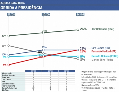 De acordo com o instituto, Bolsonaro saiu de 22% em 21 de agosto para 24% no dia 10 de setembro, até chegar aos atuais 26%. Ciro Gomes tinha 10%, passou para 13% e manteve o índice. Fernando Haddad aparecia com 4%, subiu para 10% e agora tem 13%.