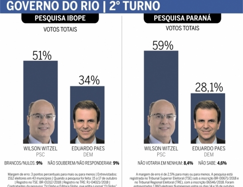 Duas pesquisas divulgadas ontem apontam que o candidato Wilson Witzel (PSC) continua em crescimento na disputa ao Governo do Estado. Foram os primeiros levantamentos do segundo turno das eleições. De acordo com levantamento do instituto Paraná Pesquisas, o ex-juiz federal registra 67,8% dos votos válidos, ante 32,2% do seu adversário, Eduardo Paes (DEM). Já no Ibope, Witzel tem 60% contra 40% do ex-prefeito do Rio. Para obter o percentual de votos válidos, os institutos de pesquisa excluem os brancos, nulos e as abstenções. É o mesmo procedimento adotado pela Justiça Eleitoral na apuração dos votos.