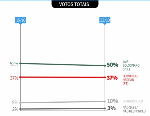 Quando inclusos brancos, nulos e indecisos, Bolsonaro caiu de 52% para 50% e Haddad se manteve em 37%. A diferença foi nos brancos e nulos, que passaram de 9% para 10%, e nos indecisos, que oscilaram de 2% para 3%.