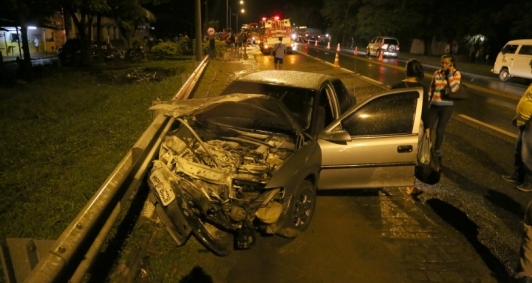 Um homem morreu e duas pessoas ficaram feridas após uma colisão transversal entre dois veículos de passeio no km 52 da BR 101, próximo ao Parque Canaã. O acidente envolveu um gol vermelho - onde estavam todas as vítimas - e um Vectra de cor cinza. Segundo informações do Corpo de Bombeiros, com o impacto da colisão, o condutor do gol foi jogado para fora do veículo, morrendo no local. Após o acidente, o condutor do Vectra colidiu com o anteparo e a parte frontal do veículo pegou fogo. As chamas foram apagadas pela chuva e, em seguida, pelo Corpo de Bombeiros.
