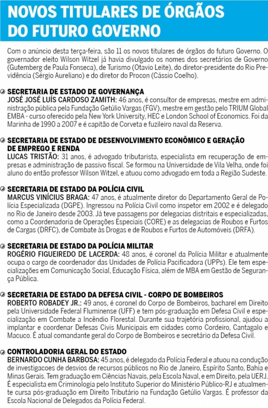 Até o momento, Witzel confirmou 11 secretários de Estado e anunciou a extinção da secretaria de Segurança Pública, com os comandantes das polícias Civil e Militar ganhando status de secretários.
