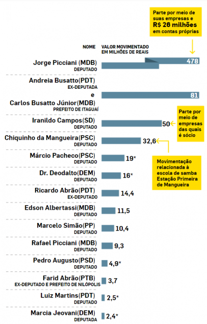 Quem lidera a lista se considerado o valor das movimentações citadas pelo Coaf é o ex-presidente da Alerj Jorge Picciani (MDB). Preso na Operação Cadeia Velha, em novembro de 2017, e também alvo da Furna da Onça, o emedebista, diz o Coaf, está atrelado a comunicações de operações financeiras no valor de R$ 478 milhões. A quantia alcança esse valor pois abarca as transações de empresas de sua família que atuam no setor de mineração e pecuária. Veja a lista completa: