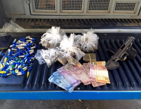 No local foram apreendidos 122 pinos de cocaína, 128 buchas de maconha, R$ 155 em espécie, além de uma pistola calibre 380 com 8 munições.