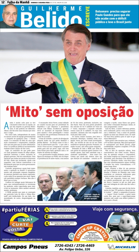 Convém, também, que pare de dar declarações do tipo “PT quebrou o Brasil de tanto roubar” – afinal, a campanha já passou – e ‘segure’ Paulo Guedes, a quem tanta corda deu, para que o super-hiper-mega ministro não acabe com déficit público e leve junto o Brasil.