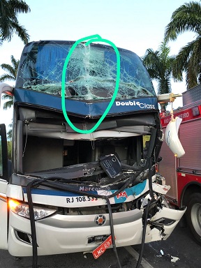 Edvar Jr. estava sentado na poltrona 8, na parte frontal do segundo andar do ônibus acidentado, como mostra a foto acima. Os passageiros foram trazidos para Campos por outro ônibus da 1001. Ao chegar aqui na cidade, Edvar Jr., sentindo forte dores no pé, foi direto buscar assistência médica. Exames comprovaram que ele quebrou o pé na colisão.