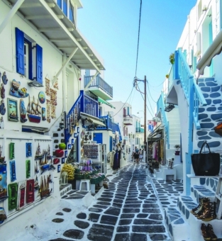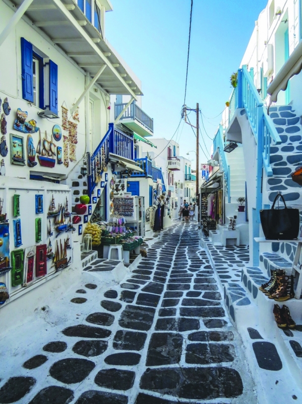 Mykonos faz parte do arquipélago das Ciclades, tem 86 km² e uma altitude máxima de 364 m, e é a ilha mais charmosa da Grécia, de estreitas vielas com lojas, bares, restaurantes, joalherias, hotéis, colados uns nos outros, num interessante e rico exemplo de aproveitamento de espaço, por onde passam 2 milhões de turistas estrangeiros anualmente.