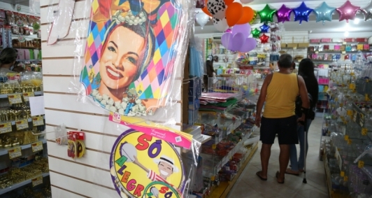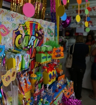 Ela também conta que perucas, chapéus de paetês, sombrinhas de frevo e colares havaianos estão fazendo muito sucesso, além das fantasias, que estão custando em torno de R$ 100 a R$ 200. A empresária Carla Dias Marinho foi uma que deixou a compra para a véspera do feriado prolongado. Ela veio em busca de fantasias para as filhas gêmeas.