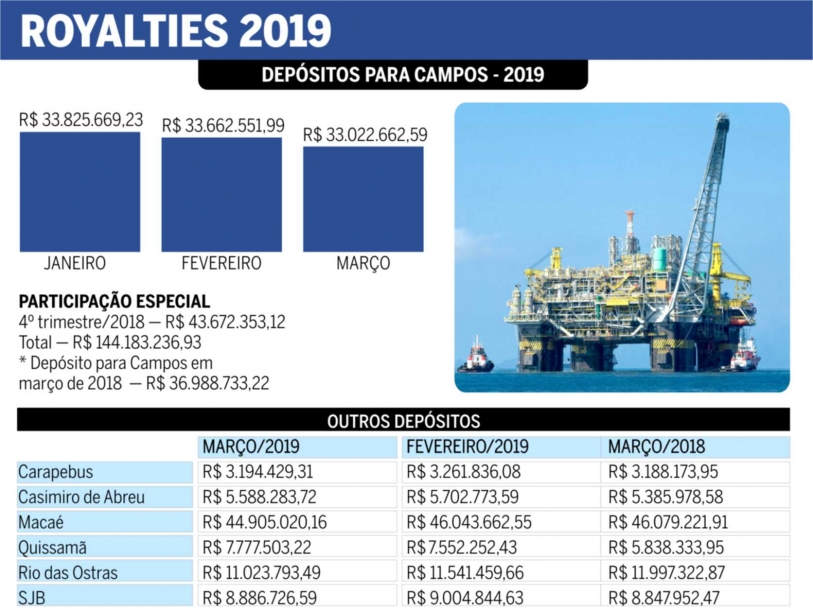 Campos recebe neste mês R$ 33.022.622,59, valor 1,9% inferior ao do repasse de fevereiro (R$ 33.662.552) e quase 11% menor que o depósito de março de 2018 (R$ 36.988.723).