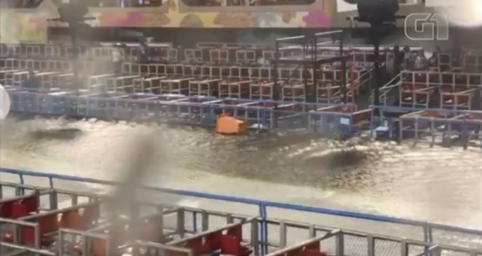 As ruas no entorno do Sambódromo também ficaram alagadas. Além da chuva e de ventos fortes, foi intensa a quantidade de raios e trovões.