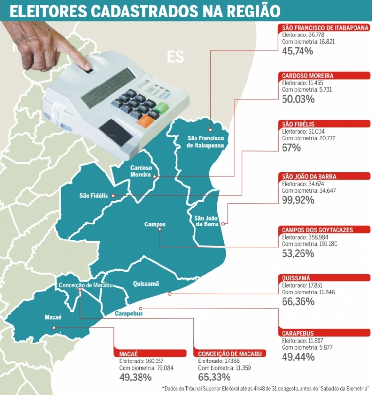 O Tribunal Regional Eleitoral (TRE) determinou plantão nesse sábado (31), de 9h às 15h, para cadastramento biométrico de eleitores, nas cidades que ainda não passaram pelo procedimento de forma obrigatória. Em Campos, 255 pessoas foram atendidas no prédio da Justiça Eleitoral até as 14h20. Antes do chamado “Sabadão da Biometria”, o maior colégio eleitoral do Norte Fluminense, que tem 358.984 eleitores, contava com registros biométricos de 53%. Na região, o recadastramento obrigatório só aconteceu, até o momento, em São João da Barra e mudou o panorama da cidade, que antes tinha mais eleitores que habitantes. Advogados que atuam na esfera eleitoral aponta a maior segurança no pleito com o cadastro da biometria.