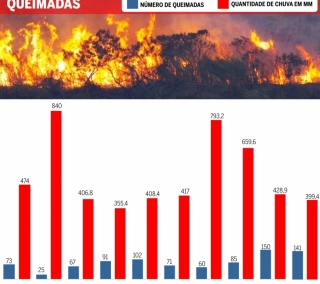 A moagem da cana-de-açúcar na região Norte Fluminense foi iniciada na segunda quinzena de abril. De acordo com os dados do Inpe, a partir de maio, aumentam o número de focos no município, que vai ficando mais intenso até o mês de agosto, que registra 34 casos. O período também é marcado pela redução das chuvas. Em junho e julho, choveu 39 mm, apenas 10% do total do ano, que vem registrando baixo volume de precipitação. De janeiro até o momento, foram 474 mm, um pouco mais da metade do registrado no ano de 2018, que teve 840 mm no mesmo período.