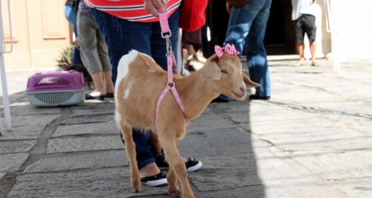 — Olha, olha a Vitória, que linda! Ela é muito lindinha — comentou uma senhora, que se aproximou repentinamente para conhecer e acariciar a cabrita pouco após a bênção aos animais, na área externa da igreja.
